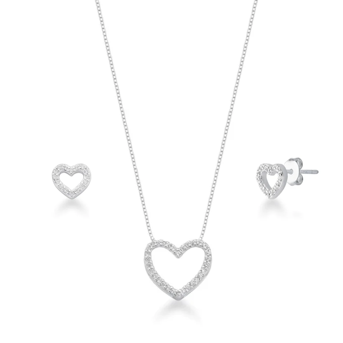 Kit Colar e Brinco De Prata Coração Vazado Cravejado