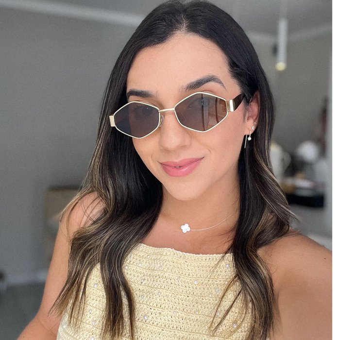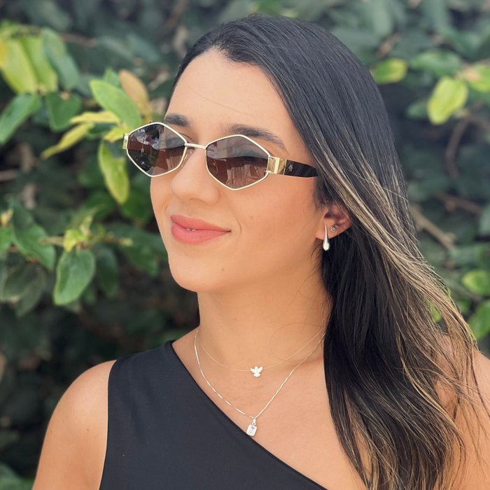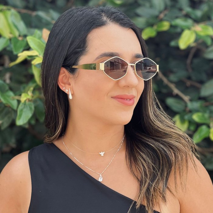 A armação metálica dourada adiciona leveza e sofisticação, enquanto as lentes em tom âmbar aquecem o visual e proporcionam um efeito mais suave e harmonioso no rosto. O resultado é um modelo marcante, mas equilibrado — estiloso sem perder a delicadeza.