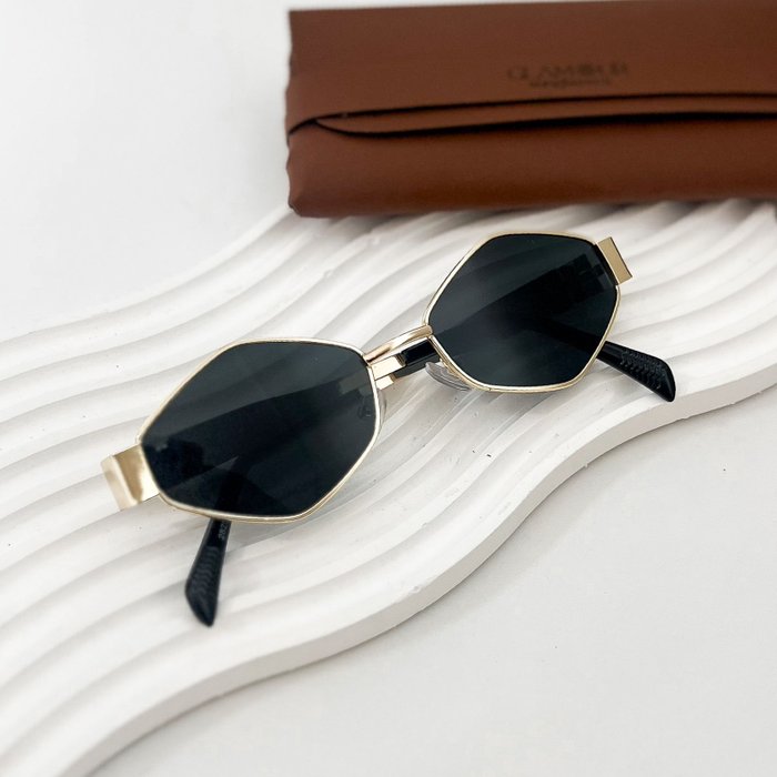 A estrutura metálica dourada adiciona sofisticação e leveza ao design, enquanto as lentes escuras criam um contraste moderno e impactante. É um modelo que transmite luxo discreto, perfeito para quem gosta de acessórios marcantes e refinados.