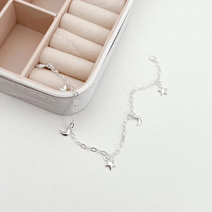 Pulseira em prata 925 com pingentes de lua e estrela — perfeita pra quem ama um toque minimalista com brilho especial.